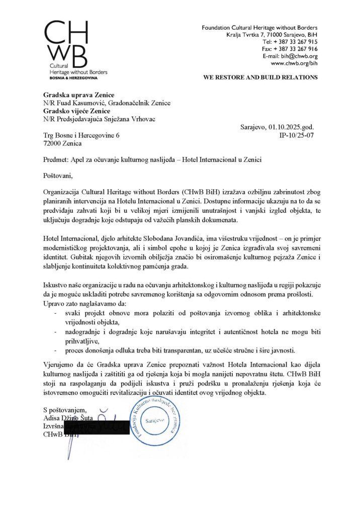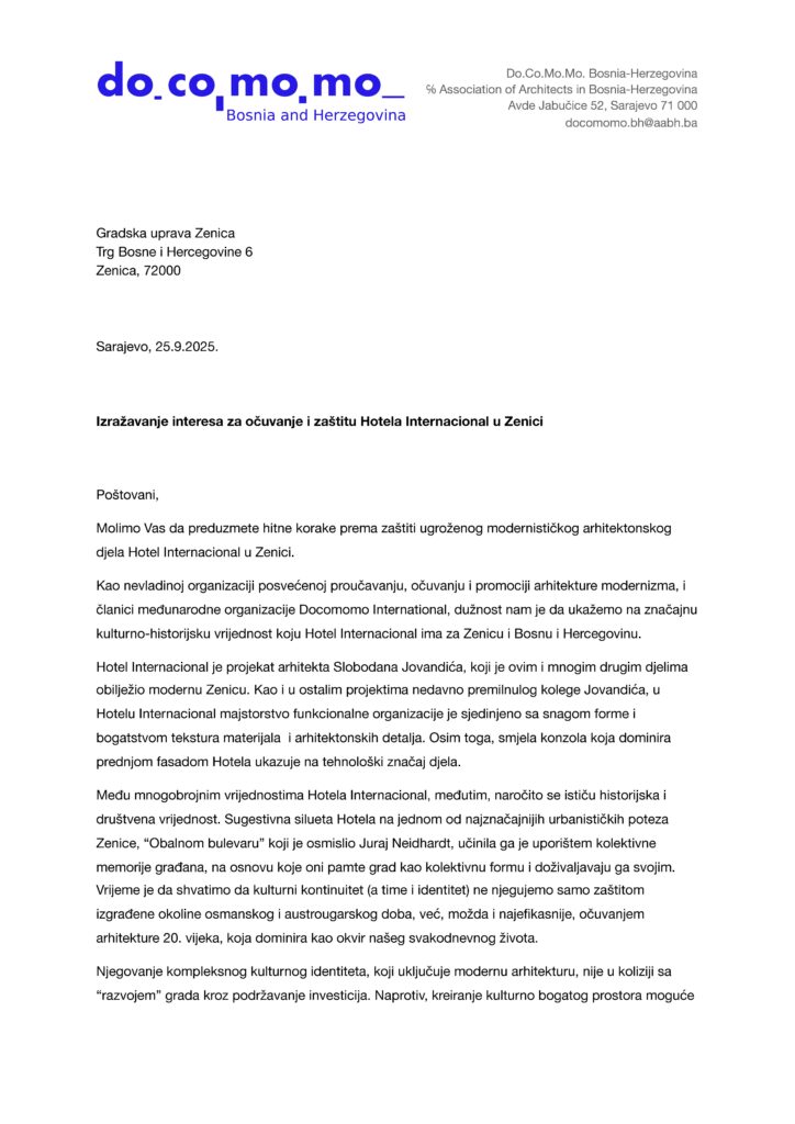 Inicijativi za očuvanje Hotela Internacional u Zenici, pored ICOMOS-a BiH, pridružile su se i dvije međunarodno priznate organizacije koje se bave zaštitom kulturno-historijskog naslijeđa: DOCOMOMO BiH i CHwB (Cultural Heritage Without Borders).