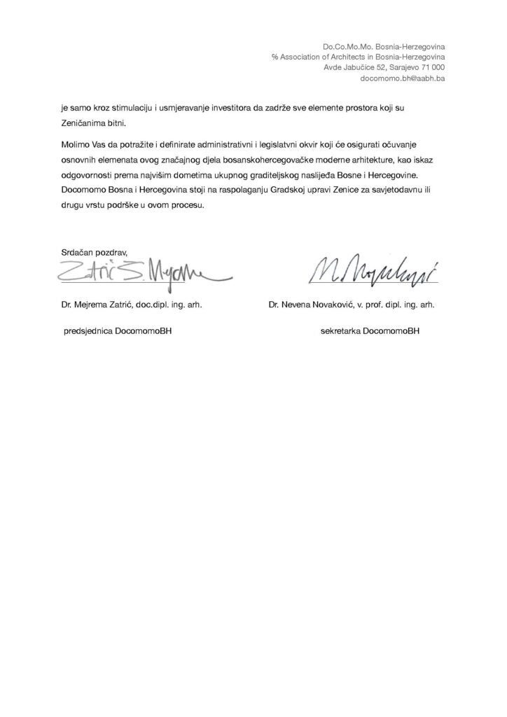 Podsjećamo da je peticija Asocijacije arhitekata u BiH još uvijek aktivna (možete je potpisati OVDJE) i biće otvorena nekoliko narednih dana. Nakon zatvaranja prikupljanja potpisa, i AABH će uputiti svoj dopis upravi grada Zenice.
